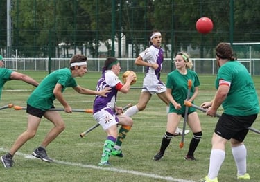 Activité se jouant en 2 équipes de minimum 7 joueurs. Enfourchez votre balais et jouer en équipe pour marquer des points avec le soaffle. Attention aux batteurs qui peuvent vous assommer avec leurs cognards et n'oubliez pas le vif d'or si vous voulez marquer beaucoup de points d'un coup et mettre fin à la partie.
